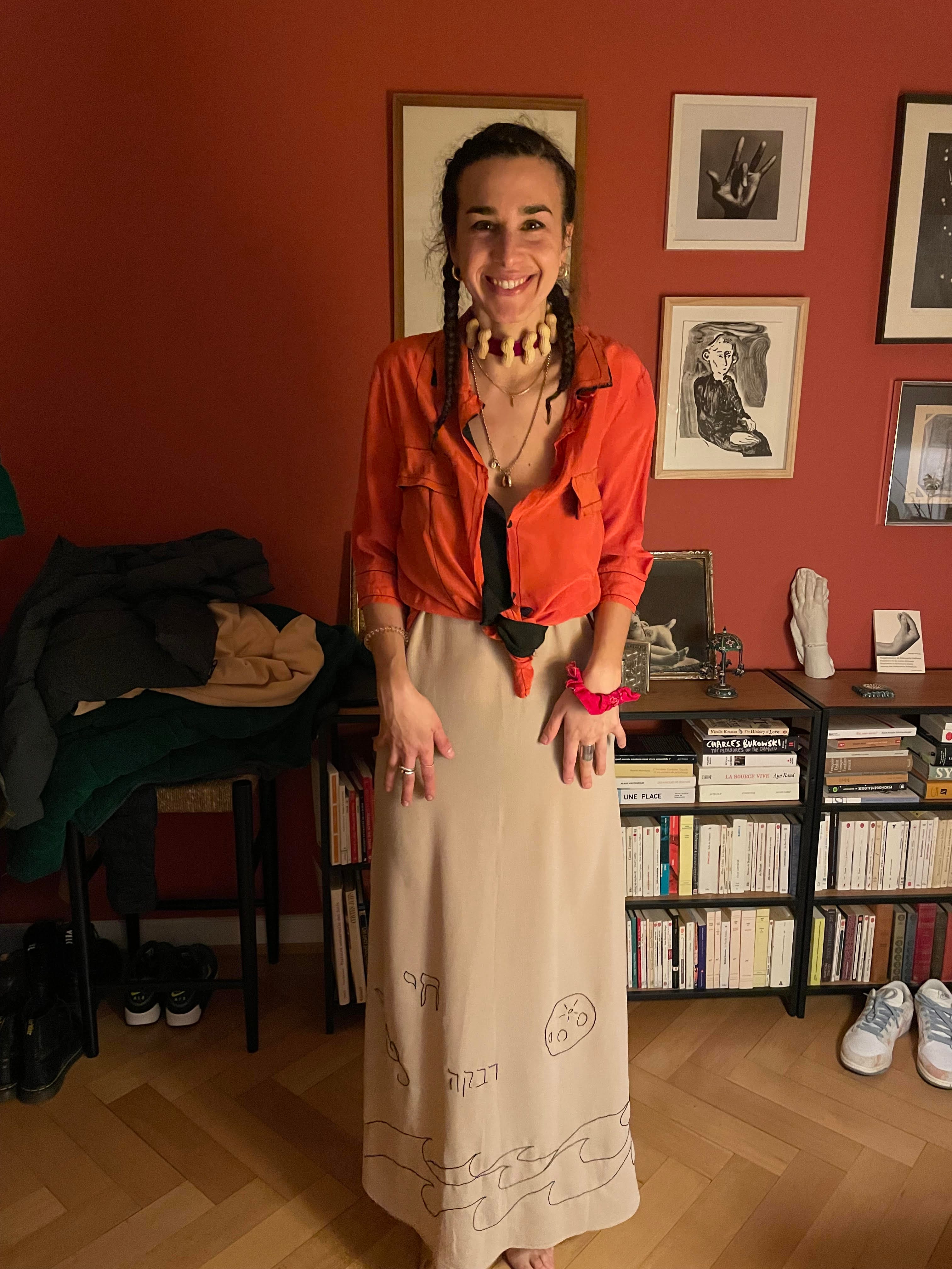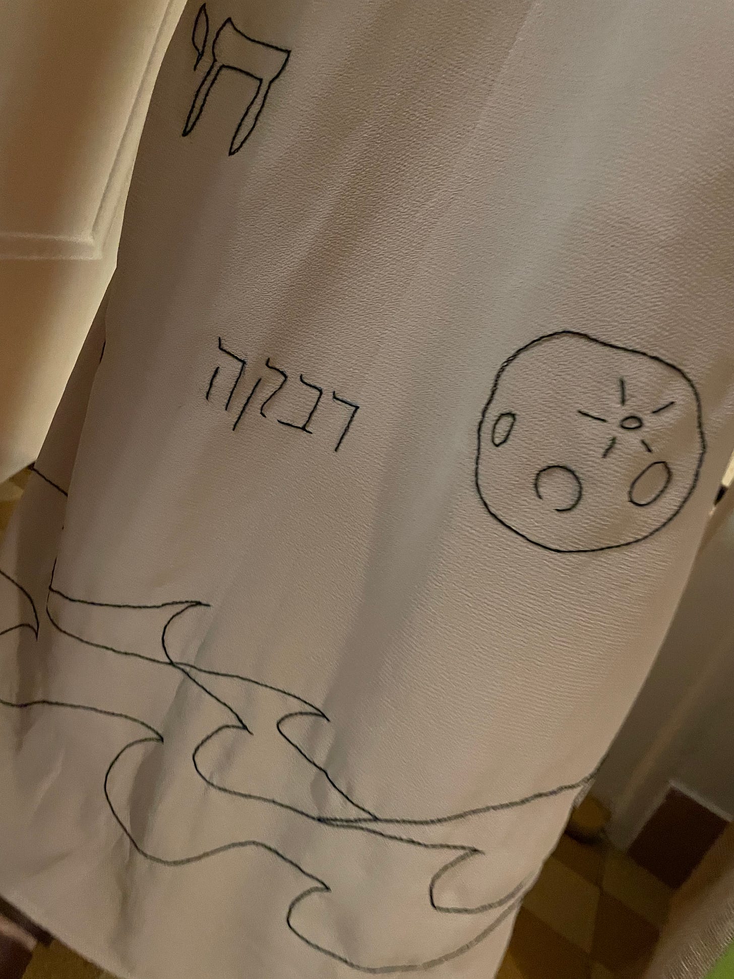 L’année dernière, à l’occasion de mon anniversaire, j’organisai une fête costumée. J’avais envie d’incorporer mon thème de Parasha Beshalah et de me faire une robe autour de la thématique de la sortie d’Egypte, de l’ouverture de la mer rouge et de la liberté. Ça ne se trouvait pas chez Zara. J’ai pu donc en l’espace d’un mois travailler l’art de la reprise. L’idée étant de garder une robe que j’avais chiné dans une boutique au Mexique en 2018, et faire des broderies dessus pour lui donner une nouvelle vie, tout en préservant le textile d’origine. C’est l’histoire d’une robe donc qui réconcilie ces trois petites lettres séparant le texte du textile.