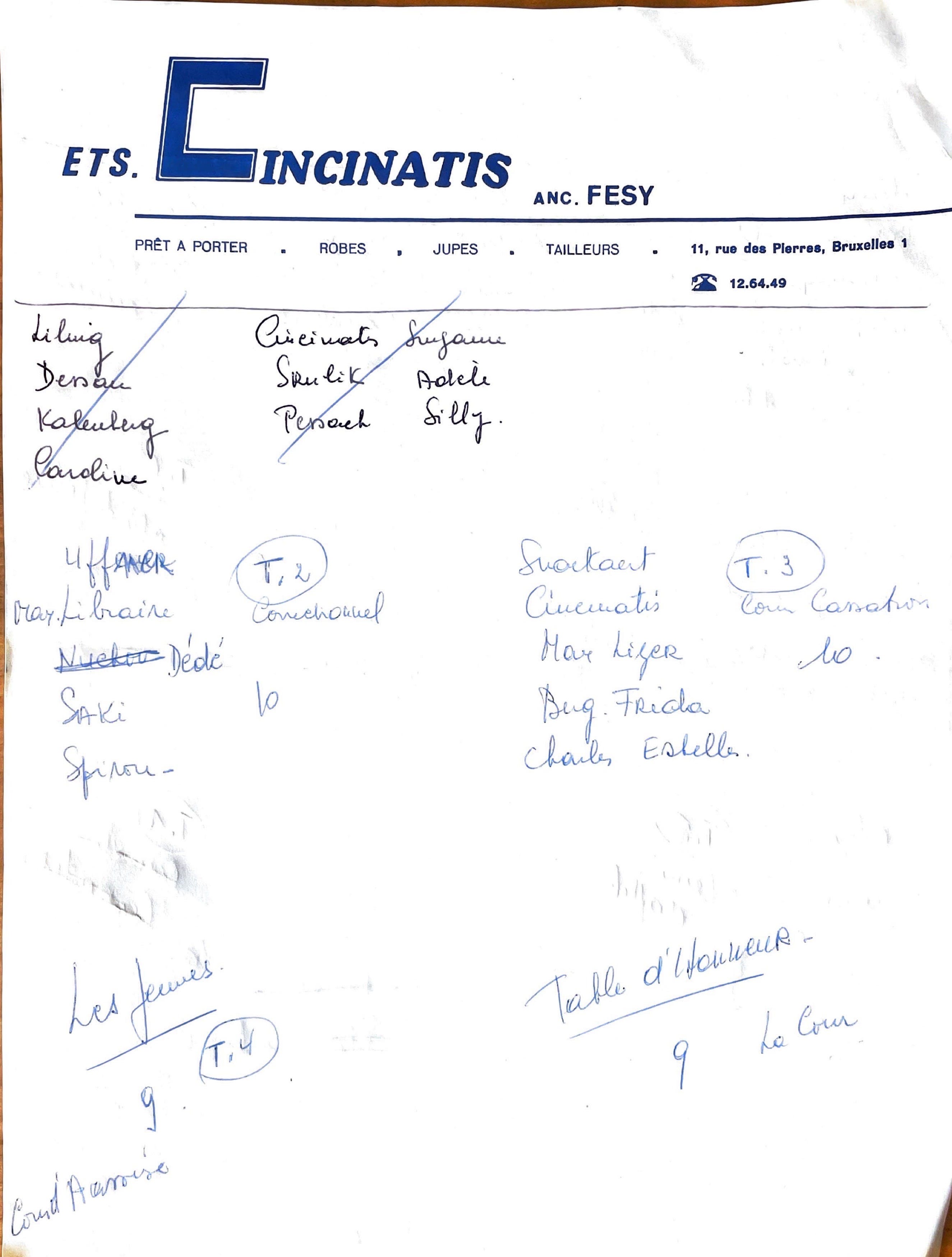 Un papier avec l’en-tête de la jeune entreprise familiale Cincinatis … utilisée pour le plan de tables de la Bar Mitsvah de mon père